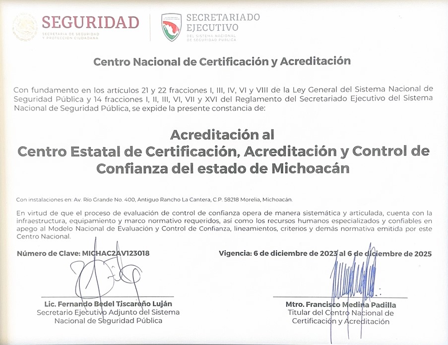 El CECACC pasó de ser un órgano creado por Decreto en 2009 a convertirse en una institución con pleno reconocimiento en la Ley del Sistema Estatal de Seguridad Pública desde 2012. Hoy se consolida como la instancia encargada de garantizar, mediante procesos estandarizados, la profesionalización y confiabilidad del personal de seguridad en Michoacán.